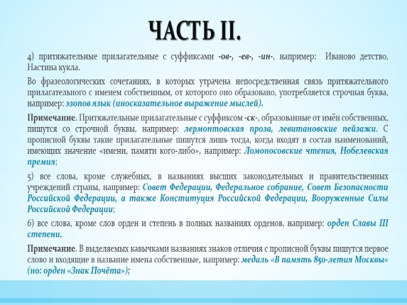 7) все слова в названиях должностных лиц и почётных званий, например: Президент Российской Федерации, Председатель Государственной Думы Российской Федерации, Верховный Главнокомандующий Вооружёнными Силами Российской Федерации, Герой России;