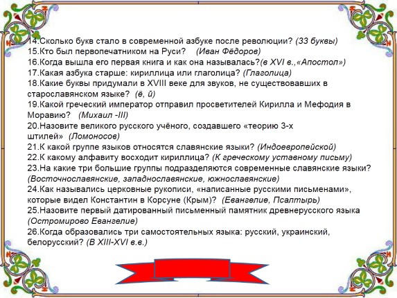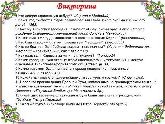 1.Кто создал славянскую азбуку? (Кирилл и Мефодий)