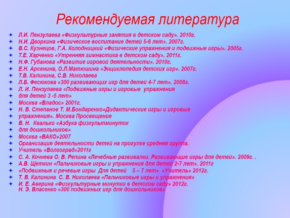 И. Е. Аверина «Физкультурные минутки в детском саду» 2012г. Н. Э. Власенко «300 подвижных игр для дошкольников»