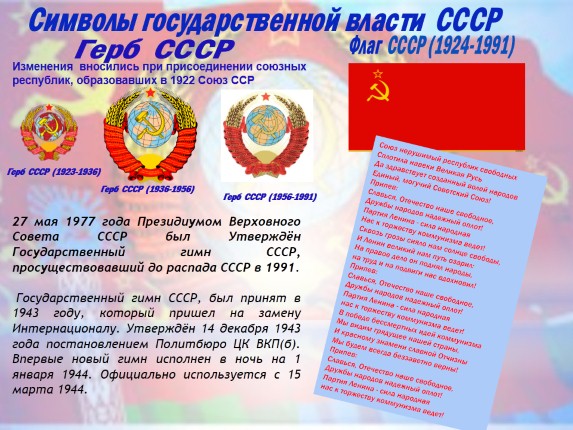 Государственный гимн СССР, был принят в 1943 году, который пришел на замену Интернационалу. Утверждён 14 декабря 1943 года постановлением Политбюро ЦК ВКП(б). Впервые новый гимн исполнен в ночь на 1 января 1944. Официально используется с 15 марта 1944.