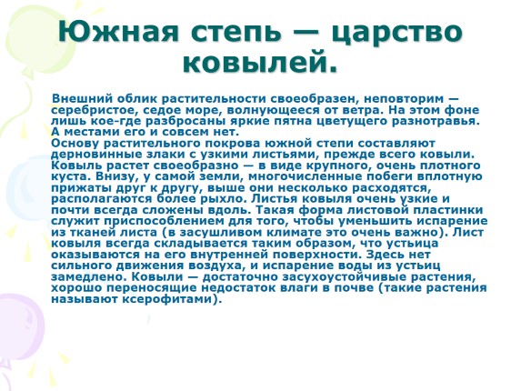 Внешний облик растительности своеобразен, неповторим — серебристое, седое море, волнующееся от ветра. На этом фоне лишь кое-где разбросаны яркие пятна цветущего разнотравья. А местами его и совсем нет. Основу растительного покрова южной степи составляют дерновинные злаки с узкими листьями, прежде всего ковыли. Ковыль растет своеобразно — в виде крупного, очень плотного куста. Внизу, у самой земли, многочисленные побеги вплотную прижаты друг к другу, выше они несколько расходятся, располагаются более рыхло. Листья ковыля очень узкие и почти всегда сложены вдоль. Такая форма листовой пластинки служит приспособлением для того, чтобы уменьшить испарение из тканей листа (в засушливом климате это очень важно). Лист ковыля всегда складывается таким образом, что устьица оказываются на его внутренней поверхности. Здесь нет сильного движения воздуха, и испарение воды из устьиц замедлено. Ковыли — достаточно засухоустойчивые растения, хорошо переносящие недостаток влаги в почве (такие растения называют ксерофитами).