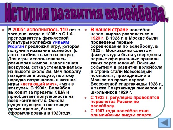 В 2005г.исполнилось 110 лет с того дня, когда в 1895г.в США преподаватель физической культуры колледжа Уильям Морган предложил игру, которая получила название волейбол (с англ. «отбивать мяч на лету»). Для игры использовалась резиновая камера, наполненная воздухом, сетка устанавливалась на высоте около 2м. Мяч подолгу находился в воздухе, поэтому нередко встречалось название игры «летающий мяч», «мяч в воздухе». В 1900г. Волейбол выходит за пределы США и приобретает популярность на всех континентах. Основа существующих в настоящее время правил, была сформулирована в 1920году.