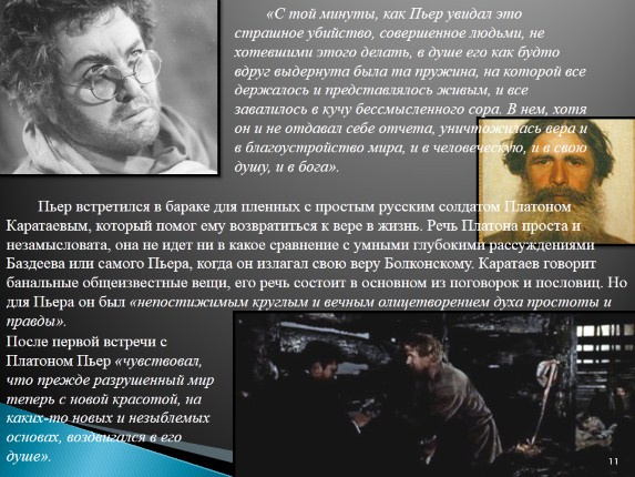 Он не может видеть многочисленные человеческие драмы, оставаясь при этом пассивным свидетелем, и поэтому, не думая о собственной безопасности, защищает женщину, заступается за помешанного, спасает из горящего дома ребенка. На его глазах чинят насилие и произвол, казнят людей, обвиненных в поджогах, которых они не совершали. Все эти жуткие и тягостные впечатления еще больше усугубляются обстановкой плена, где происходит крушение веры Пьера в справедливое устройство мира, в человека и Бога.