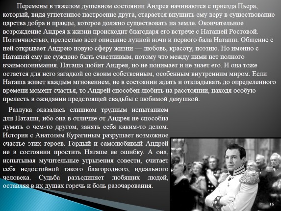 Разлука оказалась слишком трудным испытанием для Наташи, ибо она в отличие от Андрея не способна думать о чем-то другом, занять себя каким-то делом. История с Анатолем Курагиным разрушает возможное счастье этих героев. Гордый и самолюбивый Андрей не в состоянии простить Наташе ее ошибку. А она, испытывая мучительные угрызения совести, считает себя недостойной такого благородного, идеального человека. Судьба разъединяет любящих людей, оставляя в их душах горечь и боль разочарования.