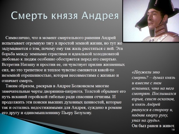 Символично, что в момент смертельного ранения Андрей испытывает огромную тягу к простой земной жизни, но тут же задумывается о том, почему ему так жаль расстаться с ней. Эта борьба между земными страстями и идеальной холодноватой любовью к людям особенно обостряется перед его смертью. Встретив Наташу и простив ее, он чувствует прилив жизненных сил, но это трепетное и теплое чувство сменяется какой-то неземной отрешенностью, которая несовместима с жизнью и означает смерть.