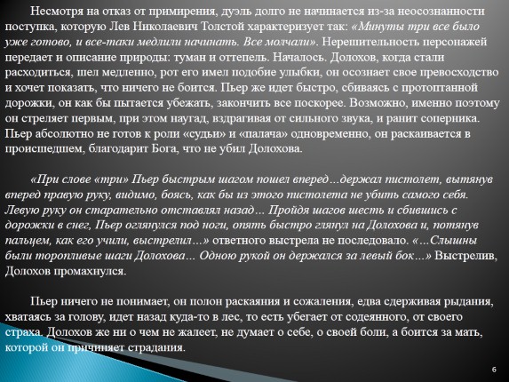 «При слове «три» Пьер быстрым шагом пошел вперед…держал пистолет, вытянув вперед правую руку, видимо, боясь, как бы из этого пистолета не убить самого себя. Левую руку он старательно отставлял назад… Пройдя шагов шесть и сбившись с дорожки в снег, Пьер оглянулся под ноги, опять быстро глянул на Долохова и, потянув пальцем, как его учили, выстрелил…» ответного выстрела не последовало. «…Слышны были торопливые шаги Долохова… Одною рукой он держался за левый бок…» Выстрелив, Долохов промахнулся.