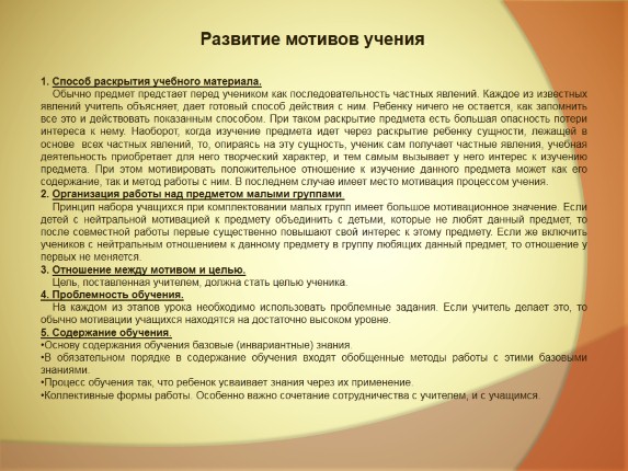 Обычно предмет предстает перед учеником как последовательность частных явлений. Каждое из известных явлений учитель объясняет, дает готовый способ действия с ним. Ребенку ничего не остается, как запомнить все это и действовать показанным способом. При таком раскрытие предмета есть большая опасность потери интереса к нему. Наоборот, когда изучение предмета идет через раскрытие ребенку сущности, лежащей в основе всех частных явлений, то, опираясь на эту сущность, ученик сам получает частные явления, учебная деятельность приобретает для него творческий характер, и тем самым вызывает у него интерес к изучению предмета. При этом мотивировать положительное отношение к изучение данного предмета может как его содержание, так и метод работы с ним. В последнем случае имеет место мотивация процессом учения.
