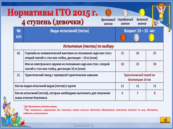 № п/п Виды испытаний (тесты) Возраст 13– 15 лет Возраст 13– 15 лет Возраст 13– 15 лет