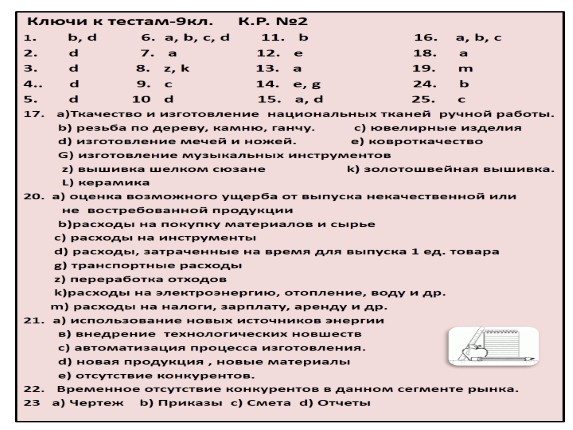 Тесты- 9класс по темам: «Технология народного промысла» и «Основы производства». К.Р.№2