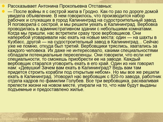 — После войны я с сестрой жила в Гродно. Как-то раз по дороге домой увидела объявление. В нем говорилось, что производится набор рабочих и служащих в город Калининград на судостроительный завод. Я поговорила с сестрой, и мы решили уехать в Калининград. Вербовка проводилась в административном здании с небольшими комнатами. Когда мы пришли, нас встретили сразу трое вербовщиков. Они наперебой уговаривали нас ехать на новые места: один — на шахты в Кузбасс, другой — на судостроительный завод в Калининград... Сейчас уже не помню, откуда был третий. Вербовщики тряслись, хватались за каждого человека. Их даже не интересовало, какими специальностями обладали потенциальные переселенцы. Они говорили, что если нет специальности, то сможешь приобрести ее на заводе. Каждый вербовщик старался уговорить ехать в его край. Один из них говорил нам: «Девушки! Зачем вам ехать в Калининград? Ведь вам там придется строить корабли под открытым небом». Но мы все же решили ехать в Калининград. Уговорил нас вербовщик с 820-го завода, работник отдела кадров по фамилии Голубев. Все три вербовщика, расхваливая прелести жизни на новом месте, упирали на то, что нам будут выданы подъемные и предоставлено жилье.