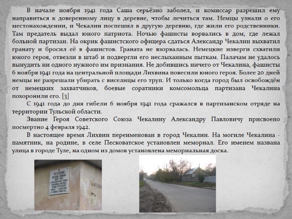 К ноябрю 1941 года партизанский отряд нанес фашистам значительный урон. Горели склады, взрывались на минах автомашины, шли под откос вражеские поезда, бесследно исчезали вражеские часовые, патрули, предатели. Однажды группа партизан, в числе которых был и Саша Чекалин, устроили засаду у дороги на Лихвин. Вдали показалась автомашина. Прошла минута - и взрыв разнес машину на части. За ней прошли и взорвались еще несколько машин. Одна из них, переполненная солдатами, пыталась проскочить. Но граната, брошенная Чекалиным, уничтожила ее. [3]