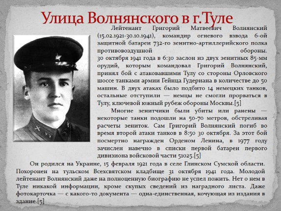 Лейтенант Григорий Матвеевич Волнянский (15.02.1921-30.10.1941), командир огневого взвода 6-ой защитной батареи 732-го зенитно-артиллерийского полка противовоздушной обороны. 30 октября 1941 года в 6:30 заслон из двух зенитных 85-мм орудий, которым командовал Григорий Волнянский, принял бой с атаковавшими Тулу со стороны Орловского шоссе танками армии Гейнца Гудериана в количестве до 50 машин. В двух атаках было подбито 14 немецких танков, остальные отступили — немцы не смогли прорваться в Тулу, ключевой южный рубеж обороны Москвы.[5]