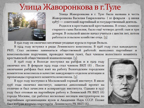 Улица Жаворонкова в г. Туле была названа в честь Жаворонкова Василия Гавриловича- ( 10 февраля - 9 июня 1987) — советский партийный и государственный деятель.
