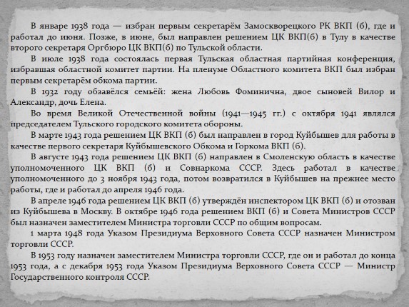 1 марта 1948 года Указом Президиума Верховного Совета СССР назначен Министром торговли СССР.
