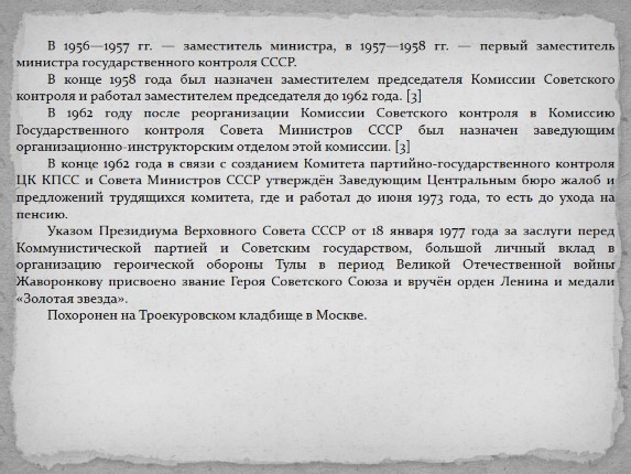 В 1956—1957 гг. — заместитель министра, в 1957—1958 гг. — первый заместитель министра государственного контроля СССР.