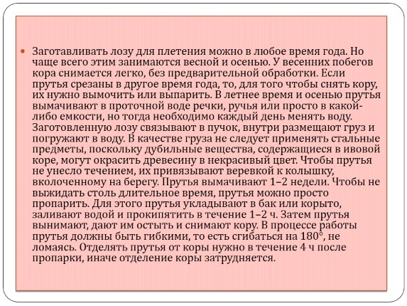 Заготавливать лозу для плетения можно в любое время года. Но чаще всего этим занимаются весной и осенью. У весенних побегов кора снимается легко, без предварительной обработки. Если прутья срезаны в другое время года, то, для того чтобы снять кору, их нужно вымочить или выпарить. В летнее время и осенью прутья вымачивают в проточной воде речки, ручья или просто в какой-либо емкости, но тогда необходимо каждый день менять воду. Заготовленную лозу связывают в пучок, внутри размещают груз и погружают в воду. В качестве груза не следует применять стальные предметы, поскольку дубильные вещества, содержащиеся в ивовой коре, могут окрасить древесину в некрасивый цвет. Чтобы прутья не унесло течением, их привязывают веревкой к колышку, вколоченному на берегу. Прутья вымачивают 1–2 недели. Чтобы не выжидать столь длительное время, прутья можно просто пропарить. Для этого прутья укладывают в бак или корыто, заливают водой и прокипятить в течение 1–2 ч. Затем прутья вынимают, дают им остыть и снимают кору. В процессе работы прутья должны быть гибкими, то есть сгибаться на 180°, не ломаясь. Отделять прутья от коры нужно в течение 4 ч после пропарки, иначе отделение коры затрудняется.