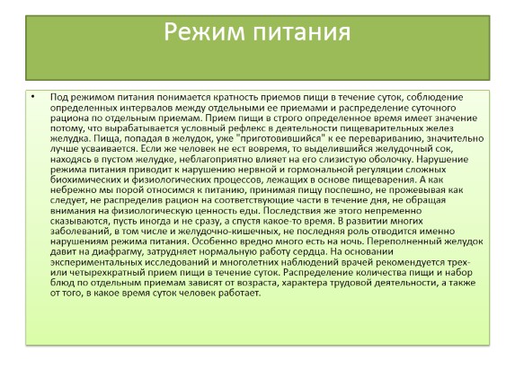 Под режимом питания понимается кратность приемов пищи в течение суток, соблюдение определенных интервалов между отдельными ее приемами и распределение суточного рациона по отдельным приемам. Прием пищи в строго определенное время имеет значение потому, что вырабатывается условный рефлекс в деятельности пищеварительных желез желудка. Пища, попадая в желудок, уже "приготовившийся" к ее перевариванию, значительно лучше усваивается. Если же человек не ест вовремя, то выделившийся желудочный сок, находясь в пустом желудке, неблагоприятно влияет на его слизистую оболочку. Нарушение режима питания приводит к нарушению нервной и гормональной регуляции сложных биохимических и физиологических процессов, лежащих в основе пищеварения. А как небрежно мы порой относимся к питанию, принимая пищу поспешно, не прожевывая как следует, не распределив рацион на соответствующие части в течение дня, не обращая внимания на физиологическую ценность еды. Последствия же этого непременно сказываются, пусть иногда и не сразу, а спустя какое-то время. В развитии многих заболеваний, в том числе и желудочно-кишечных, не последняя роль отводится именно нарушениям режима питания. Особенно вредно много есть на ночь. Переполненный желудок давит на диафрагму, затрудняет нормальную работу сердца. На основании экспериментальных исследований и многолетних наблюдений врачей рекомендуется трех- или четырехкратный прием пищи в течение суток. Распределение количества пищи и набор блюд по отдельным приемам зависят от возраста, характера трудовой деятельности, а также от того, в какое время суток человек работает.