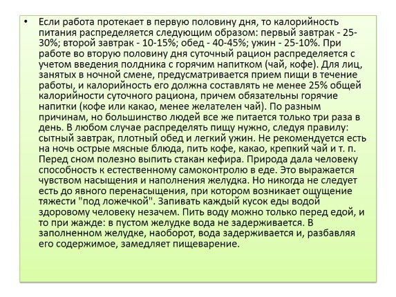 Если работа протекает в первую половину дня, то калорийность питания распределяется следующим образом: первый завтрак - 25-30%; второй завтрак - 10-15%; обед - 40-45%; ужин - 25-10%. При работе во вторую половину дня суточный рацион распределяется с учетом введения полдника с горячим напитком (чай, кофе). Для лиц, занятых в ночной смене, предусматривается прием пищи в течение работы, и калорийность его должна составлять не менее 25% общей калорийности суточного рациона, причем обязательны горячие напитки (кофе или какао, менее желателен чай). По разным причинам, но большинство людей все же питается только три раза в день. В любом случае распределять пищу нужно, следуя правилу: сытный завтрак, плотный обед и легкий ужин. Не рекомендуется есть на ночь острые мясные блюда, пить кофе, какао, крепкий чай и т. п. Перед сном полезно выпить стакан кефира. Природа дала человеку способность к естественному самоконтролю в еде. Это выражается чувством насыщения и наполнения желудка. Но никогда не следует есть до явного перенасыщения, при котором возникает ощущение тяжести "под ложечкой". Запивать каждый кусок еды водой здоровому человеку незачем. Пить воду можно только перед едой, и то при жажде: в пустом желудке вода не задерживается. В заполненном желудке, наоборот, вода задерживается и, разбавляя его содержимое, замедляет пищеварение.