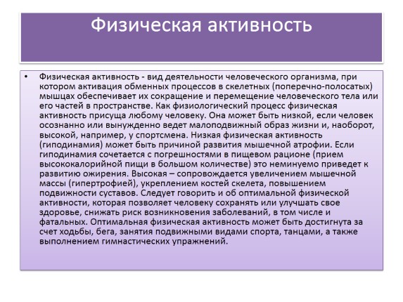 Физическая активность - вид деятельности человеческого организма, при котором активация обменных процессов в скелетных (поперечно-полосатых) мышцах обеспечивает их сокращение и перемещение человеческого тела или его частей в пространстве. Как физиологический процесс физическая активность присуща любому человеку. Она может быть низкой, если человек осознанно или вынужденно ведет малоподвижный образ жизни и, наоборот, высокой, например, у спортсмена. Низкая физическая активность (гиподинамия) может быть причиной развития мышечной атрофии. Если гиподинамия сочетается с погрешностями в пищевом рационе (прием высококалорийной пищи в большом количестве) это неминуемо приведет к развитию ожирения. Высокая – сопровождается увеличением мышечной массы (гипертрофией), укреплением костей скелета, повышением подвижности суставов. Следует говорить и об оптимальной физической активности, которая позволяет человеку сохранять или улучшать свое здоровье, снижать риск возникновения заболеваний, в том числе и фатальных. Оптимальная физическая активность может быть достигнута за счет ходьбы, бега, занятия подвижными видами спорта, танцами, а также выполнением гимнастических упражнений.