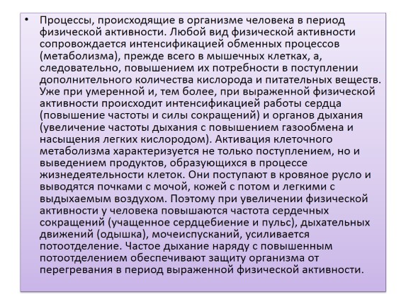 Процессы, происходящие в организме человека в период физической активности. Любой вид физической активности сопровождается интенсификацией обменных процессов (метаболизма), прежде всего в мышечных клетках, а, следовательно, повышением их потребности в поступлении дополнительного количества кислорода и питательных веществ. Уже при умеренной и, тем более, при выраженной физической активности происходит интенсификацией работы сердца (повышение частоты и силы сокращений) и органов дыхания (увеличение частоты дыхания с повышением газообмена и насыщения легких кислородом). Активация клеточного метаболизма характеризуется не только поступлением, но и выведением продуктов, образующихся в процессе жизнедеятельности клеток. Они поступают в кровяное русло и выводятся почками с мочой, кожей с потом и легкими с выдыхаемым воздухом. Поэтому при увеличении физической активности у человека повышаются частота сердечных сокращений (учащенное сердцебиение и пульс), дыхательных движений (одышка), мочеиспусканий, усиливается потоотделение. Частое дыхание наряду с повышенным потоотделением обеспечивают защиту организма от перегревания в период выраженной физической активности.