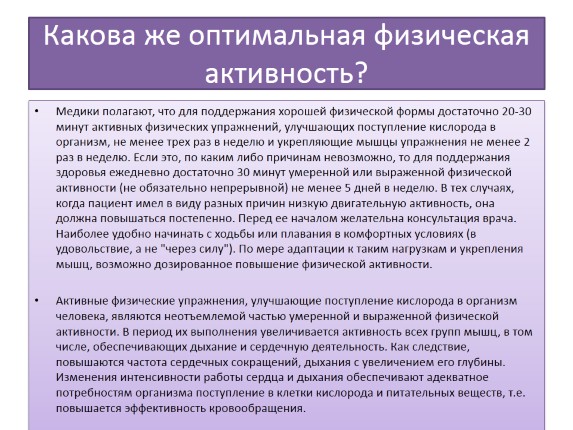 Медики полагают, что для поддержания хорошей физической формы достаточно 20-30 минут активных физических упражнений, улучшающих поступление кислорода в организм, не менее трех раз в неделю и укрепляющие мышцы упражнения не менее 2 раз в неделю. Если это, по каким либо причинам невозможно, то для поддержания здоровья ежедневно достаточно 30 минут умеренной или выраженной физической активности (не обязательно непрерывной) не менее 5 дней в неделю. В тех случаях, когда пациент имел в виду разных причин низкую двигательную активность, она должна повышаться постепенно. Перед ее началом желательна консультация врача. Наиболее удобно начинать с ходьбы или плавания в комфортных условиях (в удовольствие, а не "через силу"). По мере адаптации к таким нагрузкам и укрепления мышц, возможно дозированное повышение физической активности.