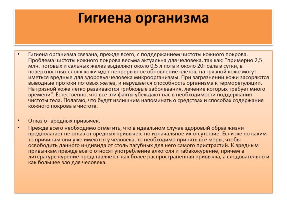 Гигиена организма связана, прежде всего, с поддержанием чистоты кожного покрова. Проблема чистоты кожного покрова весьма актуальна для человека, так как: "примерно 2,5 млн. потовых и сальных желез выделяют около 0,5 л пота и около 20г сала в сутки, в поверхностных слоях кожи идет непрерывное обновление клеток, на грязной коже могут иметься вредные для здоровья человека микроорганизмы. При загрязнении кожи засоряются выводные протоки потовых желез, и нарушается способность организма к терморегуляции. На грязной коже легко развиваются грибковые заболевания, лечение которых требует много времени". Естественно, что все эти факты убеждают нас в необходимости поддержания чистоты тела. Полагаю, что будет излишним напоминать о средствах и способах содержания кожного покрова в чистоте.