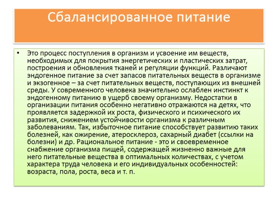 Это процесс поступления в организм и усвоение им веществ, необходимых для покрытия энергетических и пластических затрат, построения и обновления тканей и регуляции функций. Различают эндогенное питание за счет запасов питательных веществ в организме и экзогенное – за счет питательных веществ, поступающих из внешней среды. У современного человека значительно ослаблен инстинкт к эндогенному питанию в ущерб своему организму. Недостатки в организации питания особенно негативно отражаются на детях, что проявляется задержкой их роста, физического и психического их развития, снижением устойчивости организма к различным заболеваниям. Так, избыточное питание способствует развитию таких болезней, как ожирение, атеросклероз, сахарный диабет (ссылки на болезни) и др. Рациональное питание - это и своевременное снабжение организма пищей, содержащей жизненно важные для него питательные вещества в оптимальных количествах, с учетом характера труда человека и его индивидуальных особенностей: возраста, пола, роста, веса и т. п.