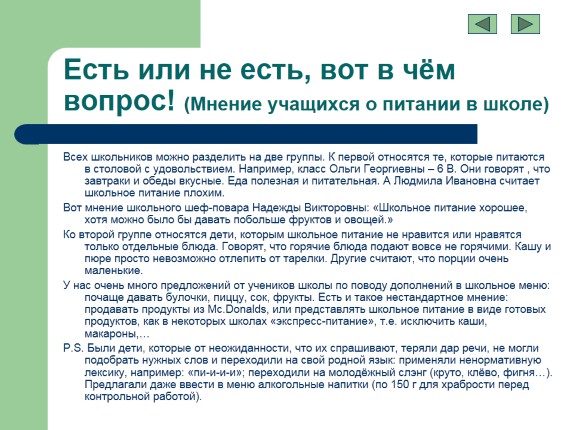 P.S. Были дети, которые от неожиданности, что их спрашивают, теряли дар речи, не могли подобрать нужных слов и переходили на свой родной язык: применяли ненормативную лексику, например: «пи-и-и-и»; переходили на молодёжный слэнг (круто, клёво, фигня…). Предлагали даже ввести в меню алкогольные напитки (по 150 г для храбрости перед контрольной работой).