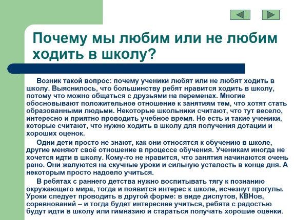 Возник такой вопрос: почему ученики любят или не любят ходить в школу. Выяснилось, что большинству ребят нравится ходить в школу, потому что можно общаться с друзьями на переменах. Многие обосновывают положительное отношение к занятиям тем, что хотят стать образованными людьми. Некоторые школьники считают, что тут весело, интересно и приятно проводить учебное время. Но есть и такие ученики, которые считают, что нужно ходить в школу для получения дотации и хороших оценок.
