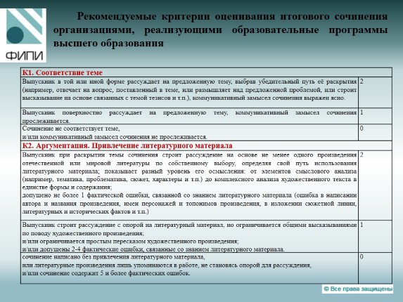 Рекомендуемые критерии оценивания итогового сочинения организациями, реализующими образовательные программы высшего образования