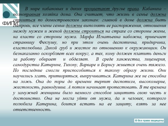 В мире кабановых и диких процветают другие права. Кабаниха – полноправная хозяйка дома. Она считает, что жизнь в семье должна строиться по домостроевским законам: главной в доме должна быть свекровь, все члены семьи должны выполнять ее распоряжения, отношения между мужем и женой должны строиться на страхе со стороны жены, на власти со стороны мужа. Марфа Игнатьевна набожна, привечает странницу Феклушу, но при этом очень деспотична, придирчива, властолюбива. Дикой груб и жесток по отношению к окружающим. Он безнаказанно оскорбляет всех вокруг, а тех, кому должен платить деньги за работу обирает и обделяет. В среде ханжества, лицемерия, самодурства Катерине, Тихону, Варваре и Борису живется очень тяжело. Но последние смогли приспособиться к такому образу жизни. Они научились лгать, притворяться, выкручиваться. Катерина же не способна на ложь. Она до поры до времени терпит деспотизм, высокомерие, жестокость, равнодушие. А потом начинает протестовать. В те времена у замужней женщины было немного способов защитить свою честь и достоинство. Она не могла уйти от мужа, да и человек, которого полюбила Катерина, боится встать на ее защиту, взять за нее ответственность.