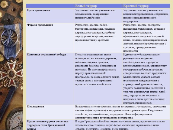 Причины поражения/ победы Попытки возвращения земли помещикам, выжигание деревень, избиение мирных граждан, расстрелы без суда, беззаконие и произвол. Не смогли предложить народу привлекательной программы, не было единого вождя, тесные связи с иностранными правительствами и войсками Идеология – большевистские руководители выдавали «необходимость» террора за волеизъявление масс, как политику государства рабочих и крестьян, совершаемую во благо трудящихся. Большевикам удалось создать иллюзорное представление о справедливой уравнительности, уверить большинство населения в том, что они получат землю, хлеб, мир, террор их не коснется, а направлен лишь против «богатых контрреволюционеров»