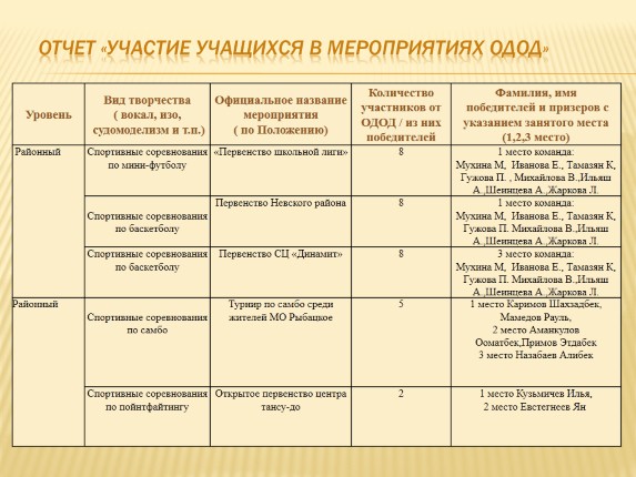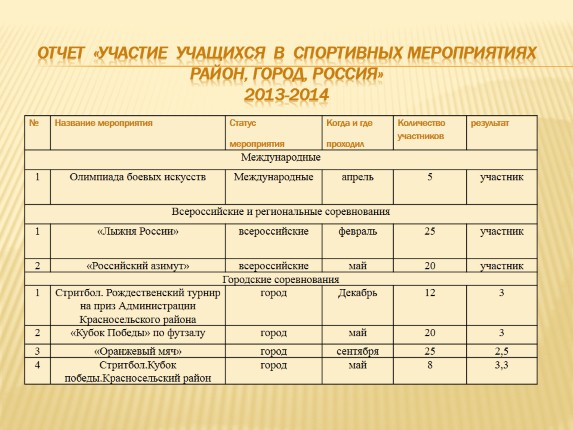 участие в спортивных соревнованиях района, города, проведение спортивных праздников;