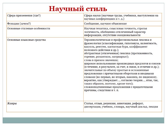 Научный стиль делится на три подстиля: собственно научный, научно-учебный и научно-популярный. Каждый из названных подстилей имеет свои особенности. В научно-учебных и научно-популярных подстилях допускается использование некоторых (отдельных) языковых средств, характерных для разговорной речи и публицистики, в том числе средств языковой выразительности (метафор, сравнений, риторических вопросов, риторических восклицаний, парцелляции и некоторых других). В текстах научного стиля могут быть представлены все типы речи: описание, повествование и рассуждение (чаще всего: рассуждение-доказательство и рассуждение-объяснение).