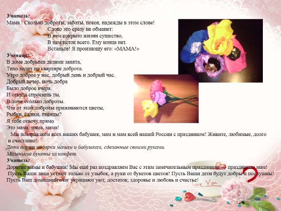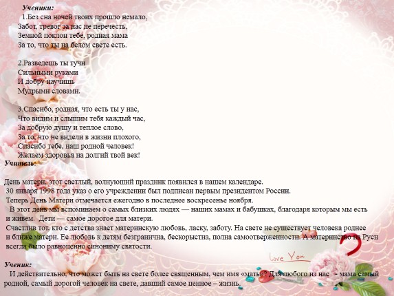 Слова “Мама, мать - одно из самых древних на Земле”. Все люди уважают и любят матерей. Словом “Мать” называют и свою Родину, чтобы подчеркнуть, что она по-матерински относится к своим детям. Во многих странах отмечается “День Матери”. Люди поздравляют своих матерей и приезжают к ним в гости, дарят подарки, устраивают для них праздник. И мы сегодня собрались поговорить о маме.