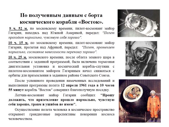 После доклада о готовности председателю Государственной комиссии Юрий сделал заявление для печати и радио. Спустя пять часов оно стало сенсацией… Находясь на железной площадке перед входом в кабину, Гагарин приветственно поднял обе руки - прощание с теми, кто оставался на Земле. Потом скрылся в кабине.