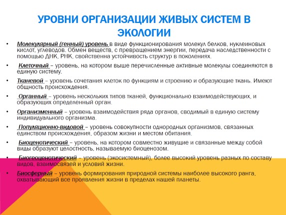 Популяционно-видовой – уровень совокупности однородных организмов, связанных единством происхождения, образом жизни и местом обитания.