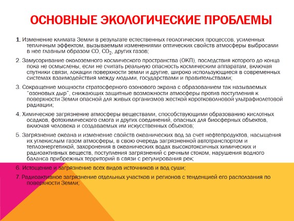 1. Изменение климата Земли в результате естественных геологических процессов, усиленных тепличным эффектом, вызываемым изменениями оптических свойств атмосферы выбросами в нее главным образом СО, СО2, других газов;