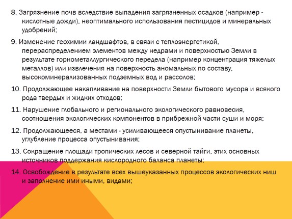 10. Продолжающее накапливание на поверхности Земли бытового мусора и всякого рода твердых и жидких отходов;