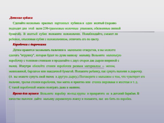 Детские кубики Сделайте несколько красных картонных кубиков и один желтый (хорошо подходят для этой цели 250-граммовые молочные упаковки, обклеенные липкой бумагой). В желтый кубик положите колокольчик. Понаблюдайте, сможет ли ребенок, отыскивая кубик с колокольчиком, отличить его по цвету. Коробочка с дырочками Детям нравится засовывать пальчики в маленькие отверстия, и вы молсете сделать "игрушку", которая будет по душе вашему малышу. Возьмите маленькую коробочку с тонкими стенками и проделайте с двух сторон две дырки шириной с палец. Изнутри обклейте стенки коробочки разным материалом -- мехом, мешковиной, бархатом или наждачной бумагой. Покажите ребенку, как сунуть пальчик в дырочку. (А вы можете сунуть свой палец в другую дырку.) Поговорите с малышом о том, что чувствует его пальчик, трогая стенки коробочки, там мягко и приятно или стенка шершавая и жесткая и т. д. С такой коробочкой можно поиграть даже в машине.