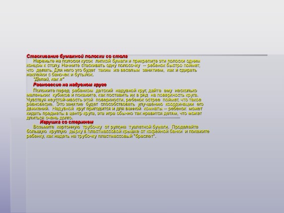 Стаскивание бумажной полоски со стола Нарежьте на полоски кусок липкой бумаги и прикрепите эти полоски одним концом к столу. Начните стаскивать одну полосочку -- ребенок быстро поймет, что делать. Для него это будет таким же веселым занятием, как и сдирать наклейки с баночек и бутылок. "Делай, как я"