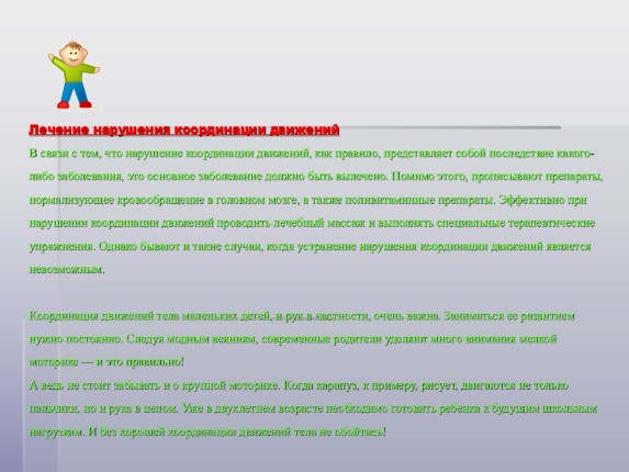 Лечение нарушения координации движений В связи с тем, что нарушение координации движений, как правило, представляет собой последствие какого-либо заболевания, это основное заболевание должно быть вылечено. Помимо этого, прописывают препараты, нормализующее кровообращение в головном мозге, а также поливитаминные препараты. Эффективно при нарушении координации движений проводить лечебный массаж и выполнять специальные терапевтические упражнения. Однако бывают и такие случаи, когда устранение нарушения координации движений является невозможным. Координация движений тела маленьких детей, и рук в частности, очень важна. Заниматься ее развитием нужно постоянно. Следуя модным веяниям, современные родители уделяют много внимания мелкой моторике — и это правильно! А ведь не стоит забывать и о крупной моторике. Когда карапуз, к примеру, рисует, двигаются не только пальчики, но и рука в целом. Уже в двухлетнем возрасте необходимо готовить ребенка к будущим школьным нагрузкам. И без хорошей координации движений тела не обойтись!