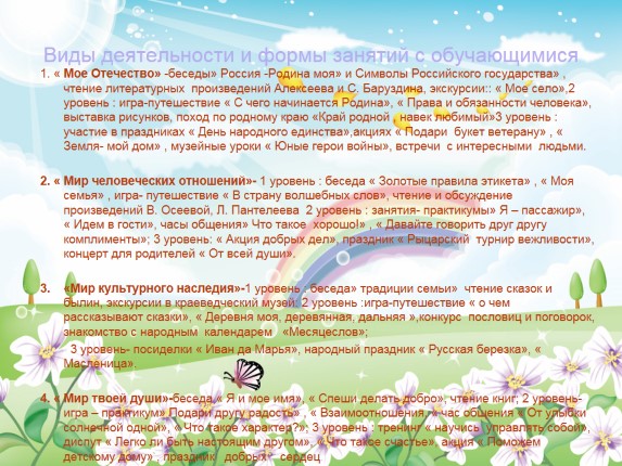 1. « Мое Отечество» -беседы» Россия -Родина моя» и Символы Российского государства» , чтение литературных произведений Алексеева и С. Баруздина, экскурсии:: « Мое село»,2 уровень : игра-путешествие « С чего начинается Родина», « Права и обязанности человека», выставка рисунков, поход по родному краю «Край родной , навек любимый»3 уровень : участие в праздниках « День народного единства»,акциях « Подари букет ветерану» , « Земля- мой дом» , музейные уроки « Юные герои войны», встречи с интересными людьми.