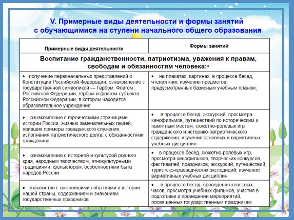 V. Примерные виды деятельности и формы занятий