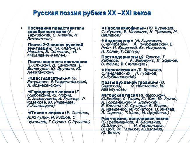 Рок-поэзия, популярная песня (Б.Гребенщиков, А. Башлачев, Ю.Шевчук, И. Кормильцев, В. Цой, И. Тальков, А.Шаганов, Ю. Энтин)