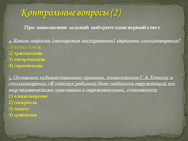 4. Каким пафосом (авторским настроением) окрашено стихотворение? 1) элегическим 5. Основным художественным приемом, позволившим