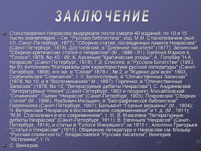 Стихотворения Некрасова выдержали после смерти 40 изданий, по 10 и 15 тысяч экземпляров. - См. "Русская библиотека", изд. М.М. Стасюлевичем (вып. VII, Санкт-Петербург, 1877); "Сборник статей, посвященных памяти Некрасова" (Санкт-Петербург, 1878); Достоевский, в "Дневнике писателя" (1877); Зелинский "Сборник критических статей о Некрасове" (М., 1886 - 91); Евгений Марков в "Голосе", 1878, No 42 - 89; К. Арсеньев "Критические этюды"; А. Голубев "Н.А. Некрасов" (Санкт-Петербург, 1878); Г.З. Елисеев, в "Русском Богатстве" (1893, No 9); Антонович "Материалы для характеристики русской литературы" (Санкт-Петербург, 1868); его же, в "Слове" 1878 г., № 2, и "Журнал для всех" 1903; Скабичевский "Сочинения", т. II; Белоголовый, в "Отечественных Записках" (1878, No 10, и в "Воспоминаниях" М., 1897); Горленко, в "Отечественных Записках" (1878, No 12; "Литературные дебюты Некрасова"); С. Андреевский "Литературные Чтения" (Санкт-Петербург, 1893 и позднее); Михайловский "Сочинения"; Пыпин "Некрасов" (Санкт-Петербург, 1905); Покровский "Сборник статей" (М., 1906); Якубович-Мельшин, в "Биографической библиотеке" Павленкова (Санкт-Петербург, 1907); Бальмонт "Горные вершины" (М., 1904); Ч. Ветринский "Некрасов в воспоминаниях современников" и т. д. (М., 1911); "М.М. Стасюлевич и его современники", т. III; В. Максимов "Литературные дебюты Некрасова" (Санкт-Петербург, 1911); В. Евгеньев "Некрасов" (Санкт-Петербург, 1914), и статьи в "Голосе Минувшего" за 1915 г.; Аполлон Григорьев "Статья о Некрасове" (1915). Обширную литературу о Некрасове см. Мезьер "Русская словесность"; Владиславлев "Русские писатели"; Венгеров "Источники", т. IV.