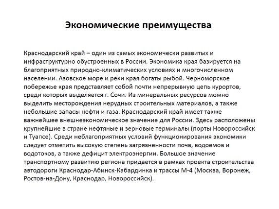 Краснодарский край – один из самых экономически развитых и инфраструктурно обустроенных в России. Экономика края базируется на благоприятных природно-климатических условиях и многочисленном населении. Азовское море и реки края богаты рыбой. Черноморское побережье края представляет собой почти непрерывную цепь курортов, среди которых выделяется г. Сочи. Из минеральных ресурсов можно выделить месторождения нерудных строительных материалов, а также небольшие запасы нефти и газа. Краснодарский край имеет также важнейшее внешнеэкономическое значение для России. Здесь расположены крупнейшие в стране нефтяные и зерновые терминалы (порты Новороссийск и Туапсе). Среди неблагоприятных условий функционирования экономики следует отметить высокую степень загрязненности почв, водоемов и водотоков, а также дефицит электроэнергии. Большое значение транспортному развитию региона придается в рамках проекта строительства автодороги Краснодар-Абинск-Кабардинка и трассы М-4 (Москва, Воронеж, Ростов-на-Дону, Краснодар, Новороссийск).