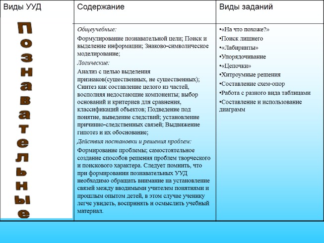 Формирование проблемы; самостоятельное создание способов решения проблем творческого и поискового характера. Следует помнить, что при формировании познавательных УУД необходимо обращать внимание на установление связей между вводимыми учителем понятиями и прошлым опытом детей, в этом случае ученику легче увидеть, воспринять и осмыслить учебный материал. «На что похоже?»