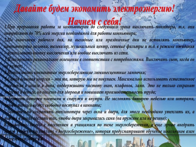 Проводить беседы с населением и учащимися по теме энергосбережения, а еще лучше внедрить новую учебную дисциплину «Энергосбережение», которая предусматривает обучение школьников азам сбережения энергии.